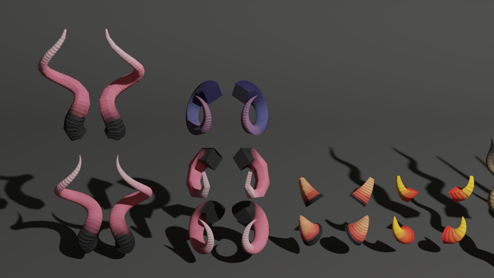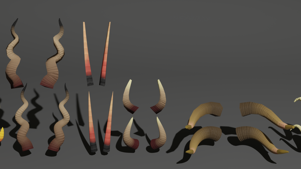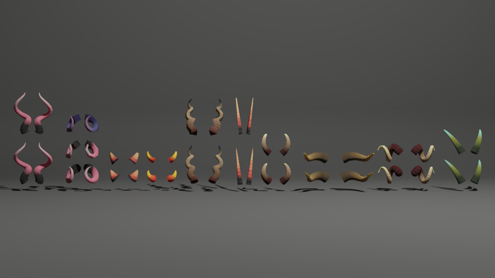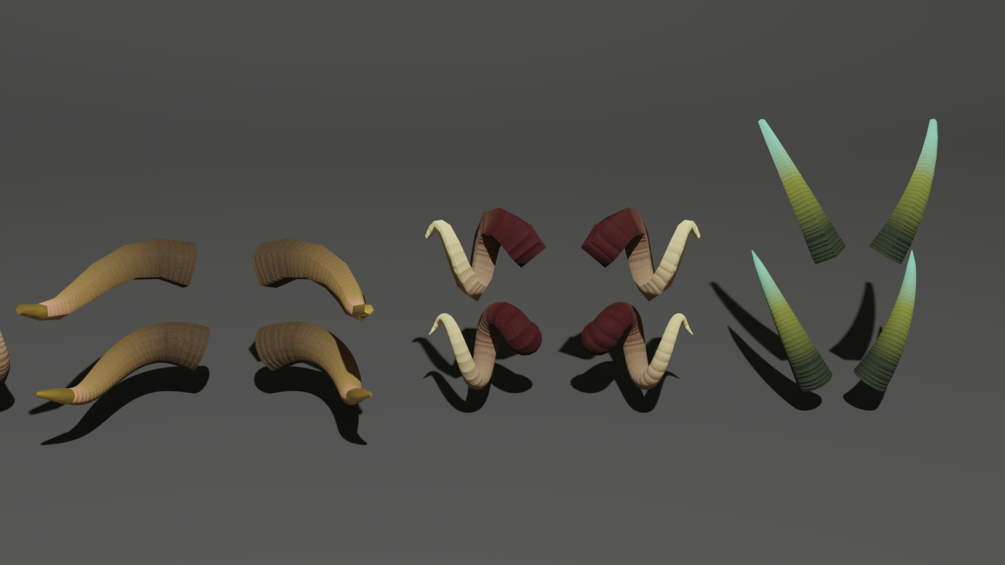 A geometry nodes tool for making a wide variety of horns, ranging from highly performance friendly to highly performance intensive. Includes several textures and several example horns.